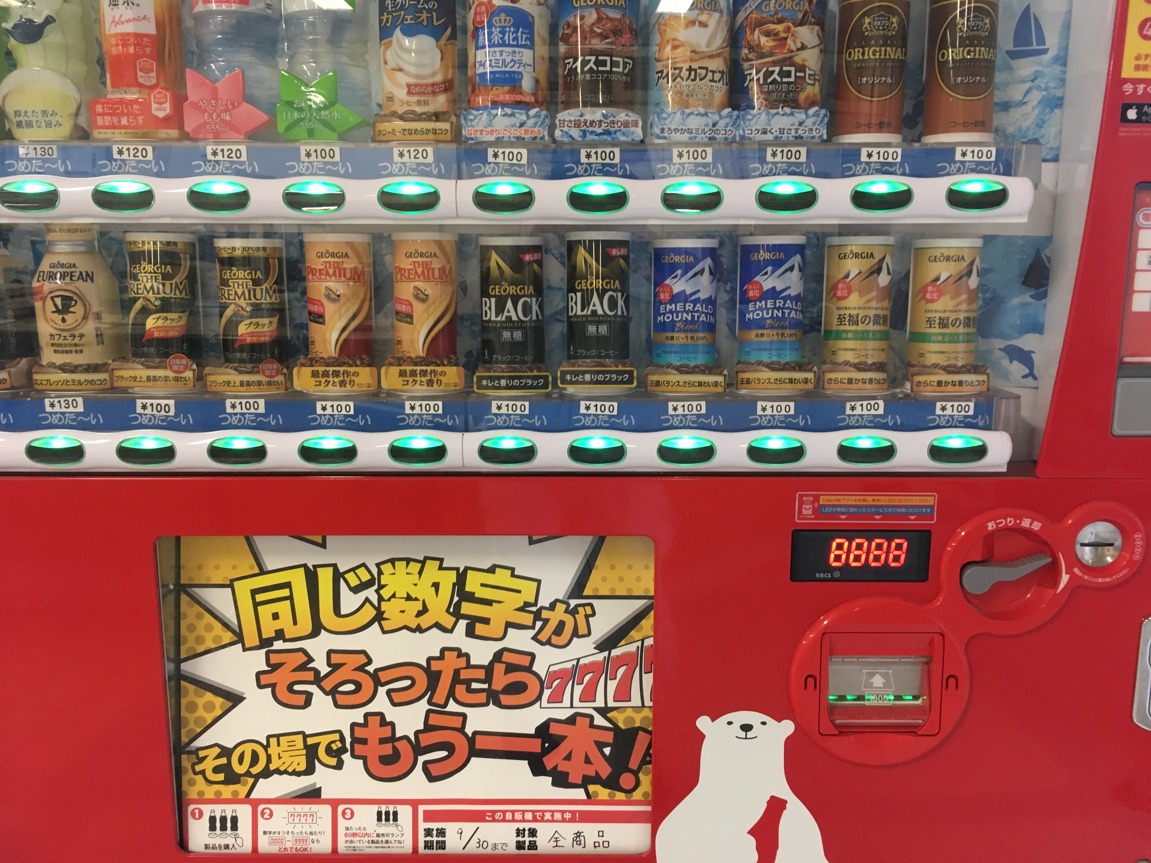 ただいま期間限定のコカ・コーラの自販機の抽選モード。ゾロ目が揃えばその場でもう一本のサービス。なぜかうちの自販機よく当たるんです。料金も100円ですのでジュースを買うなら是非いらしてください。